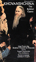 “The opera is presented complete–this is the only full-length performance of the work on videocassette–and the sumptuous sets and costumes are a feast for the eyes. Conductor Yuri Simonov leads the forces of the Bolshoi with great power and a complete understanding of the complicated score. Special praise must go to the much-acclaimed Bolshoi Chorus, which lives up to its reputation. From the opening strains, depicting dawn over Moscow, to the fortune-teller’s haunting vision of Galitsyn’s downfall and on to the finale in which the Old Believers go to their deaths rather than submit to the New Order, Khovanshchina is a riveting operatic experience, here vividly brought to life.”