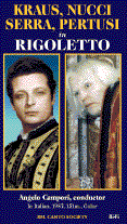 Because of bizarre lighting, this title is recommended only for lovers of these singers. (One does get used to the lighting, however.) For a traditional Rigoletto, in fine quality, see #550, with Gobbi.–Stefan Zucker